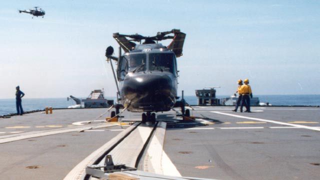 The SAMAHE® helicopter handling system can transfer a 10-ton helicopter between the hangar and flight deck of a navy ship in less than two minutes. Designed by DCNS, a French naval defense and energy company, the SAMAHE® system operates safely up to sea state 6 (waves up to 6 meters high) and can be configured for use on a variety of ships, from corvettes to frigates. Nine navies worldwide are using the SAMAHE® system.
