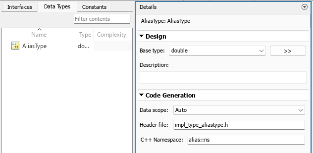 3. Select the alias data type, and expand the Code Generation section in the Details pane.