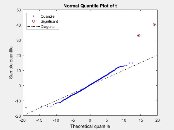 Figure contains an axes object. The axes object with title Normal Quantile Plot of t, xlabel Theoretical quantile, ylabel Sample quantile contains 3 objects of type line. One or more of the lines displays its values using only markers These objects represent Quantile, Significant, Diagonal.