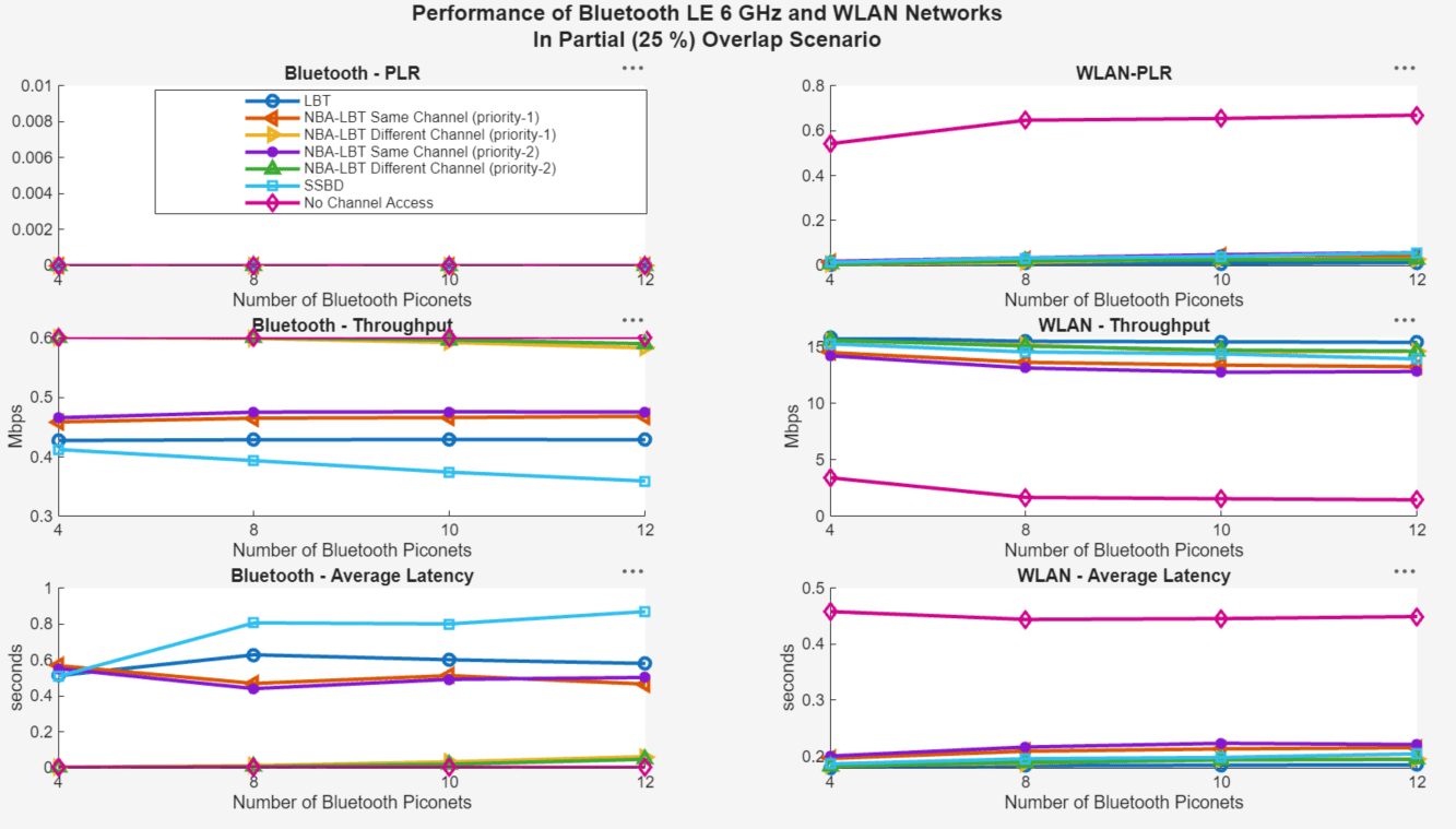 By disabling LBT at the Bluetooth nodes, you can observe that Bluetooth induces high packet loss, reduced throughput, and increased latency in WLAN. If you enable LBT, interference in WLAN decreases, but Bluetooth experiences reduced throughput and increased latency due to fewer opportunities to transmit packets compared to when LBT is disabled. SSBD shows higher latency and slightly lower throughput than LBT because it listens longer, capturing packets from other nodes on the same channel. NBA-LBT demonstrates better Bluetooth performance compared to both LBT and SSBD, particularly when operating on a different channel. This improved performance occurs because NBA-LBT can hop to free channels, reducing contention and increasing successful transmissions. On the WLAN side, the impact of NBA-LBT is similar to, or even better than, that of LBT or SSBD, as channel hopping minimizes interference and helps better WLAN performance. To ensure coexistence between Bluetooth and WLAN with minimal degradation at both nodes, configure the channel access mechanisms to suit your specific environment and application. You can adjust the channel access configuration properties using the helperBluetoothChannelAccessConfig helper object and rerun the simulation. Additionally, increasing the number of Bluetooth piconets increases interference in WLAN, leading to higher packet loss rates and reduced throughput.