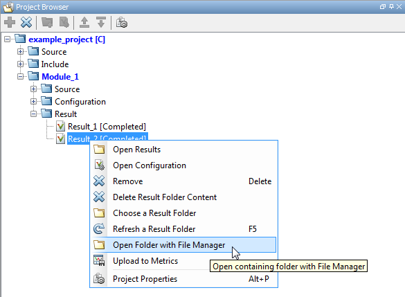 1. Right-click the result folder name on the Project Browser pane. From the context menu, select Open Folder with File Manager.