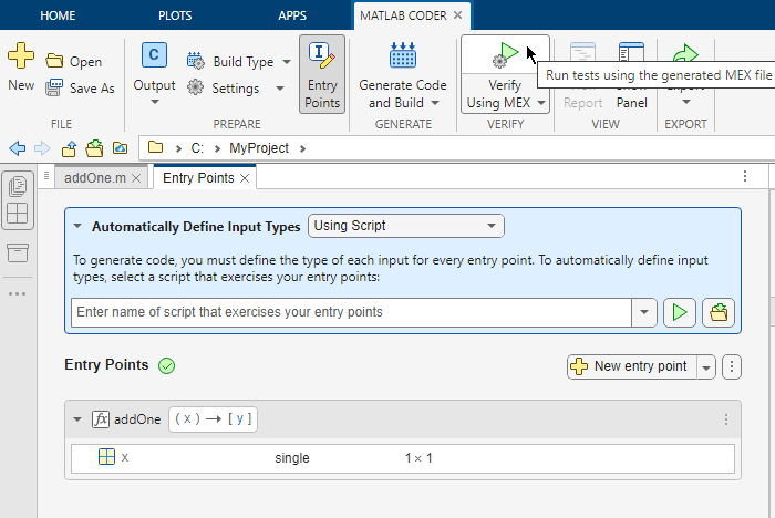 1. Open the Entry Points pane by clicking the Entry Points button in the MATLAB Coder toolstrip.