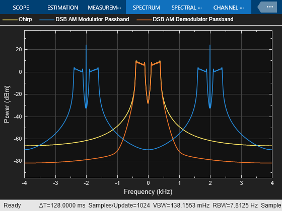 Plot the input signal, the modulated sidebands, and the demodulated signal by using a spectrum analyzer.