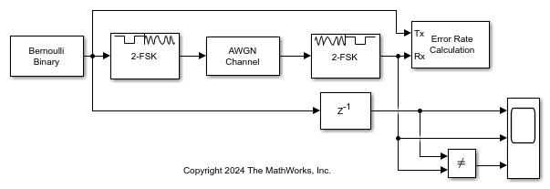 The cm_2fsk_mod_demod model 2-FSK-modulates a random binary signal, applies AWGN, and then 2-FSK-demodulates the signal. An Error Rate Calculation block computes the SER. In the Error Rate Calculation block, a setting of 1 for the Receive delay parameter accounts for a 1 sample delay.