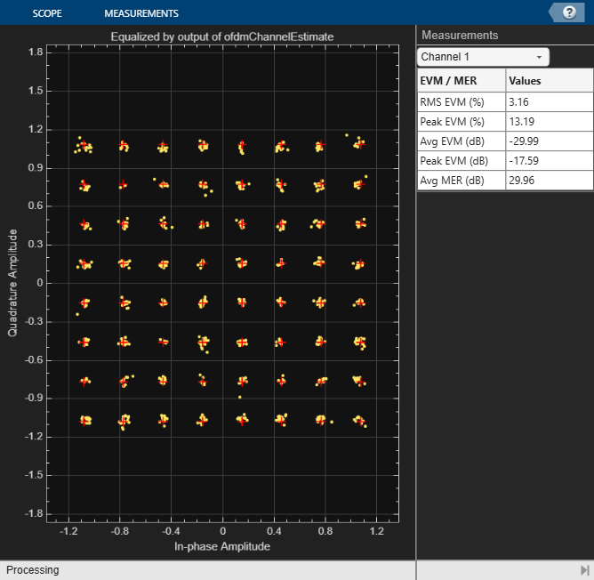 constdiag = comm.ConstellationDiagram(Title = 'Equalized by output of ofdmChannelEstimate',... ReferenceConstellation = qammod(0:M-1,M,UnitAveragePower=true),... EnableMeasurements = true, Position = [100 100 800 800]);