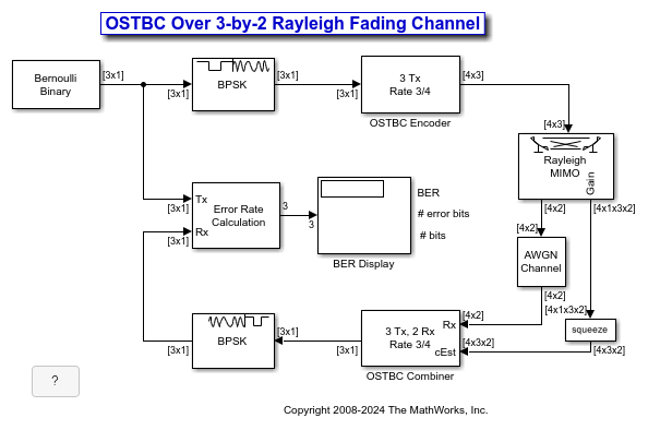 Simulate orthogonal space-time block codes (OSTBC) to achieve diversity gains in a multiple-input multiple-output (MIMO) communications system. The example shows the transmission of data over three transmit antennas and two receive antennas using independent Rayleigh fading per link.