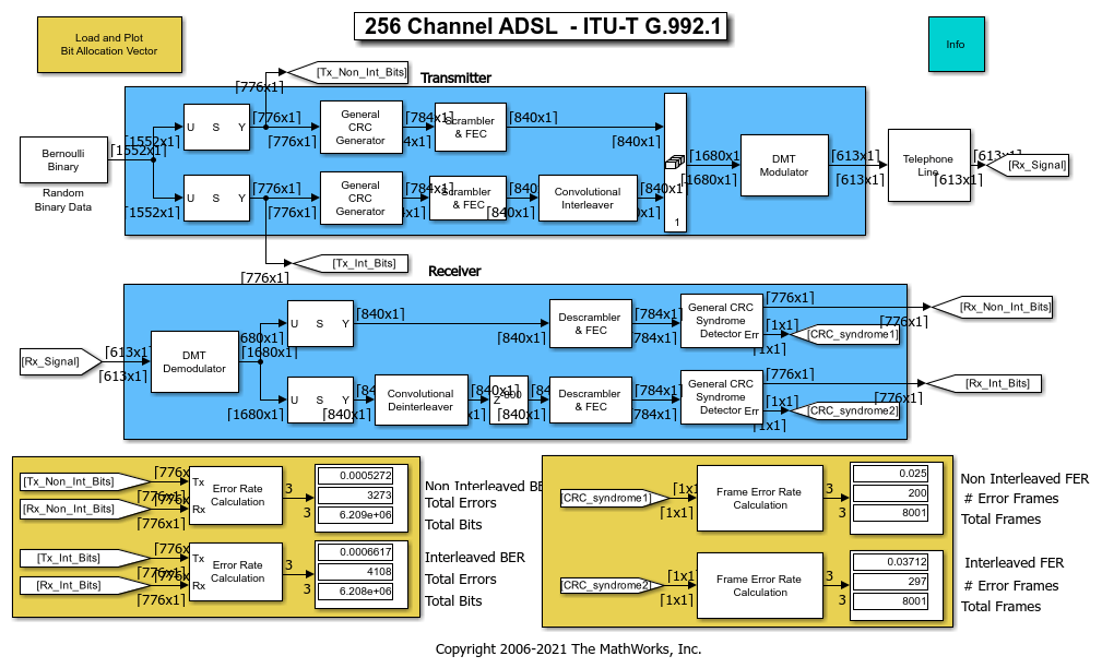 The transmitter portion of the model, shaded in blue at the top of the model, contains two parallel paths. One path (the fast buffer) processes the first 776 bits of each 1552-bit data frame, while the other path (the interleaved buffer) processes the last 776 bits of each data frame. Each path appends eight cyclic redundancy check (CRC) bits to its 776-bit frame, scrambles the bits, and encodes them using a shortened Reed-Solomon code. The scrambling and encoding operations interpret the bits as integers between 0 and 127. In the second path but not the first, a Convolutional Interleaver block interleaves the encoded data. This interleaving operation increases the second path's resistance to burst errors but also adds latency. Finally, the data from the two routes is concatenated and modulated. Data from the fast buffer is modulated to the low frequency subcarriers, while data from the interleaved buffer is modulated to the high frequency subcarriers, according to the bit allocation vector b. This example assumes that the bit allocation vector is known and uses the vector to calculate the channel. Click commadsl;get_param('commadsl','ModelWorkspace');commandwindow to see in the MATLAB® Command Window the calculations involved.