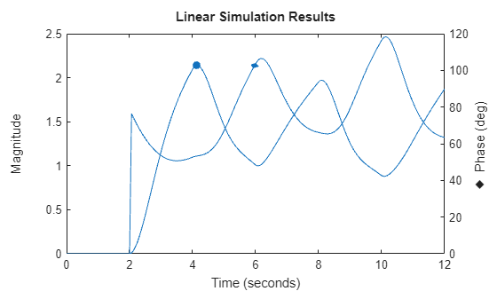 The plot shows the magnitude and phase of the response on a single axes, indicating the phase plot using a diamond marker.