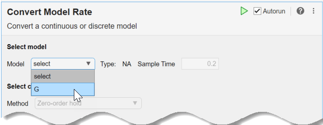 Convert Model Rate permite convertir un modelo LTI en tiempo continuo a tiempo discreto de manera interactiva. También se puede utilizar para remuestrear un modelo en tiempo discreto. La tarea genera automáticamente código de MATLAB® para un script en vivo.