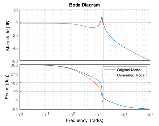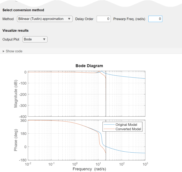 La tarea discretiza automáticamente el modelo usando el tiempo de muestreo predeterminado (0.2 segundos) y el método de conversión predeterminado, Zero-order hold. También crea un diagrama de Bode, que permite comparar las respuestas del modelo original y el convertido.