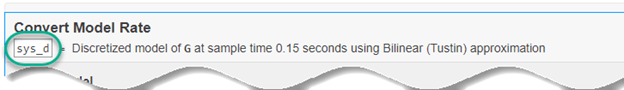De forma predeterminada, el código generado utiliza sysConverted como nombre de la variable de salida, que es el modelo convertido. Para especificar un nombre de variable de salida diferente, introduzca el nuevo nombre en la línea de resumen en la parte superior de la tarea. Por ejemplo, cambie el nombre a sys_d.
