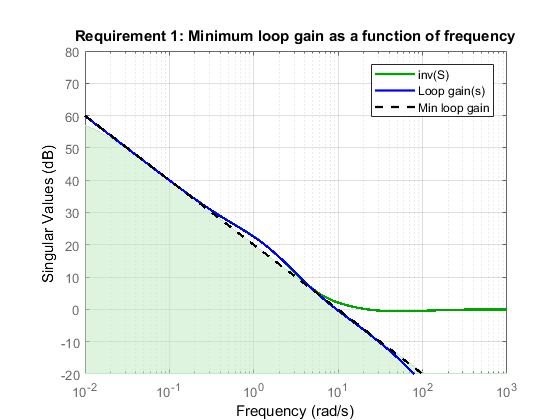 The following figure shows a typical specified minimum gain profile (dashed line) and a resulting tuned loop gain, L (blue line). The green region represents gain profile values that are forbidden by this requirement. The figure shows that when L is much larger than 1, imposing a minimum gain on inv(S) is a good proxy for a minimum open-loop gain.