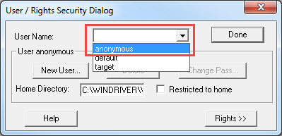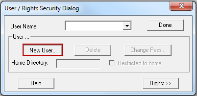 In the User/Rights Security dialog box window, set Home Directory to the folder location that you selected in step 2. Click Done.