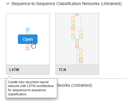 Para crear una red de secuencias, en la sección Sequence-to-Sequence Classification Networks (Untrained), haga clic en LSTM.