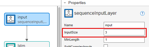 Seleccione la capa de entrada de secuencias input y establezca InputSize en 3.