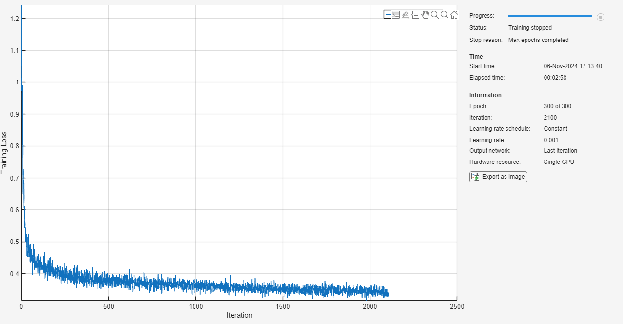 options = trainingOptions("adam", ... MaxEpochs=300, ... SequencePaddingDirection="left", ... Shuffle="every-epoch", ... Plots="training-progress", ... Verbose=false);