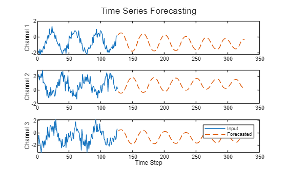 figure l = tiledlayout(numChannels,1); title(l,"Time Series Forecasting") for i = 1:numChannels nexttile plot(X(1:offset,i)) hold on plot(offset+1:numTimeSteps,Y(:,i),"--") ylabel("Channel " + i) end xlabel("Time Step") legend(["Input" "Forecasted"])