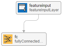 Desde Layer Library, arrastre una capa featureInputLayer al lienzo. Puede usar el filtro Layer Library para encontrar capas. Seleccione la capa. En el panel Properties, establezca Normalization en "zscore" e InputSize en el número de características de sus datos. A continuación, arrastre una capa fullyConnectedLayer al lienzo. Para conectar las capas, deténgase en featureInputLayer y haga clic en el puerto out. Arrastre la flecha hasta el puerto in de la capa fullyConnectedLayer.