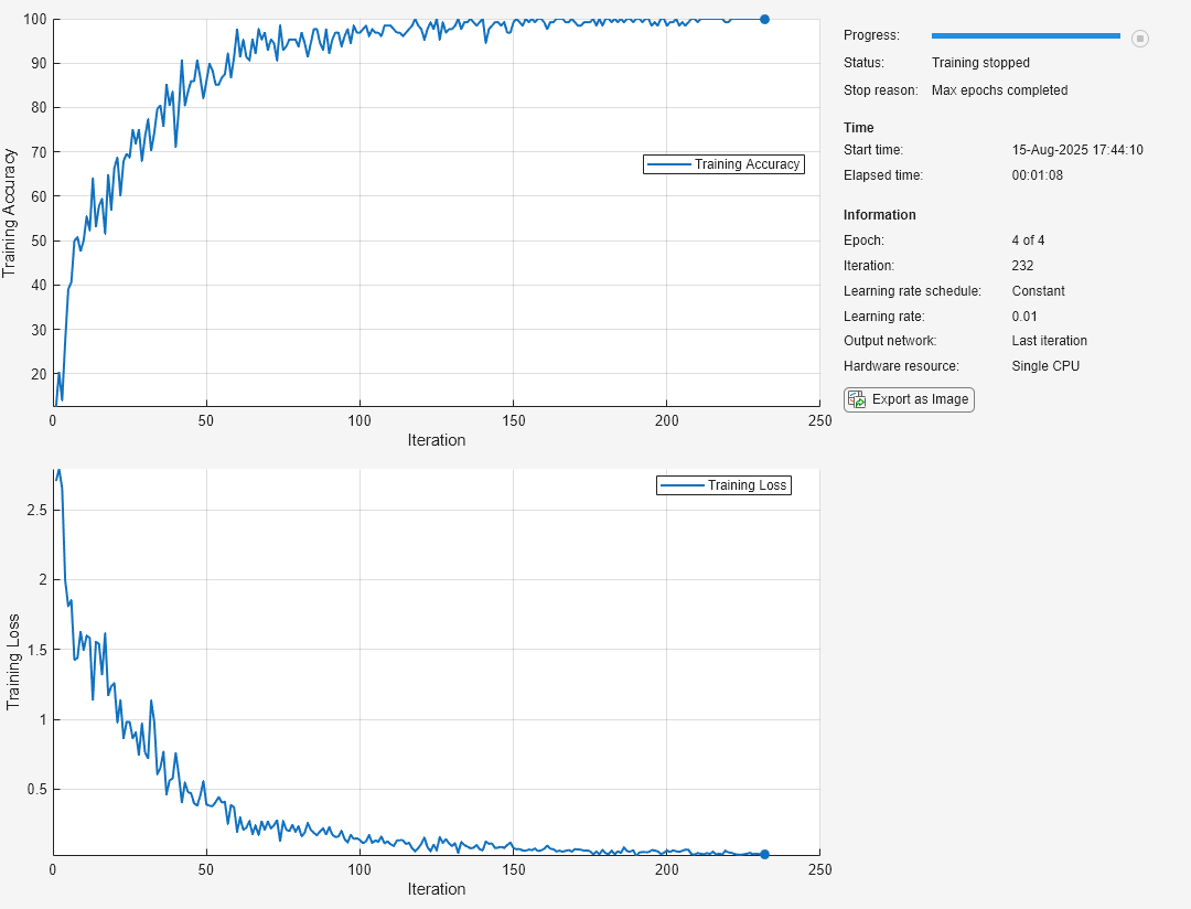 options = trainingOptions("sgdm", ... MaxEpochs=4, ... Verbose=false, ... Plots="training-progress", ... Metrics="accuracy");