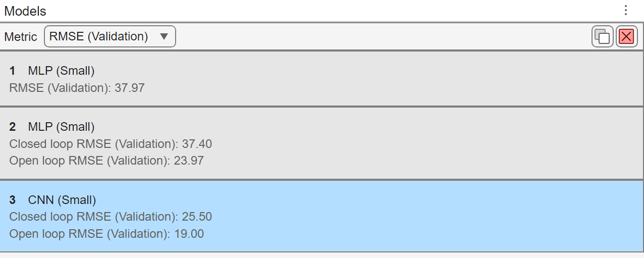 The app reports the root mean squared error (RMSE) for both the closed-loop and open-loop modes. You can view these scores in the Models list at the left of the app. The open-loop RMSE is usually smaller because the ground-truth data continuously corrects the predictions of the model. In the closed-loop mode, errors in the predictions accumulate over time.