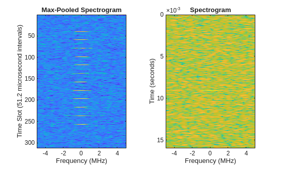 Figure contains 2 axes objects. Axes object 1 with title Max-Pooled Spectrogram, xlabel Frequency (MHz), ylabel Time Slot (51.2 microsecond intervals) contains an object of type image. Axes object 2 with title Spectrogram, xlabel Frequency (MHz), ylabel Time (seconds) contains an object of type image.