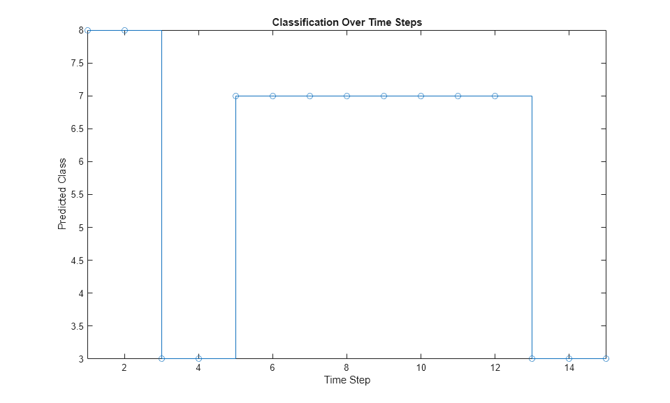 labels = squeeze(out.YPred.Data(1:numTimeSteps,1)); figure stairs(labels, '-o') xlim([1 numTimeSteps]) xlabel("Time Step") ylabel("Predicted Class") title("Classification Over Time Steps")