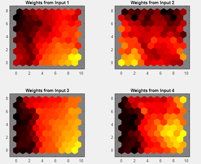Represente los planos de pesos (también denominados planos de componentes). En la sección Plots, haga clic en Weight Planes. La figura muestra un plano de pesos para cada elemento de las características de entrada (en este ejemplo, cuatro). La gráfica muestra los pesos que conectan cada entrada con cada una de las neuronas, donde los colores más oscuros representan pesos mayores. Si los patrones de conexión de dos características son muy similares, se puede asumir que las características están muy correlacionadas.