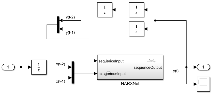 exportNetworkToSimulink(trainedNARXNet,FrameBased=true);