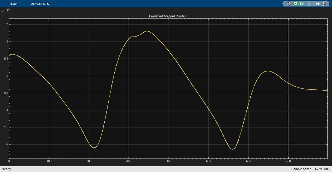 figure tiledlayout(2,1) nexttile plot(current) xlabel("Time Step") ylabel("Current") nexttile plot(position) xlabel("Time Step") ylabel("Magnet Position")
