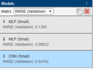 After training, the root mean square error (RMSE) of the model on the validation data appears in the models list.