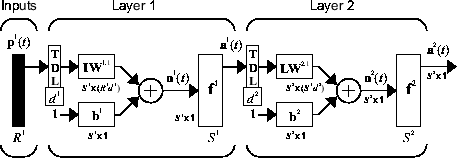 The FTDNN had the tapped delay line memory only at the input to the first layer of the static feedforward network. You can also distribute the tapped delay lines throughout the network. The distributed TDNN was first introduced in [WaHa89] for phoneme recognition. The original architecture was very specialized for that particular problem. The following figure shows a general two-layer distributed TDNN.