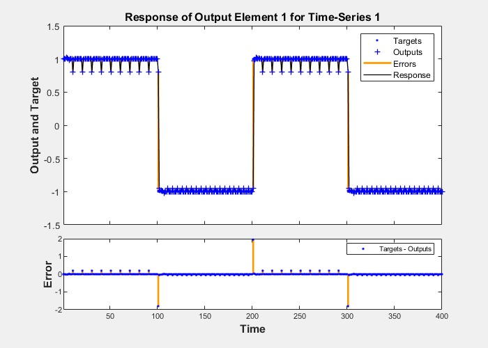 time = 0:99; y1 = sin(2*pi*time/10); y2 = sin(2*pi*time/5); y = [y1 y2 y1 y2]; t1 = ones(1,100); t2 = -ones(1,100); t = [t1 t2 t1 t2];