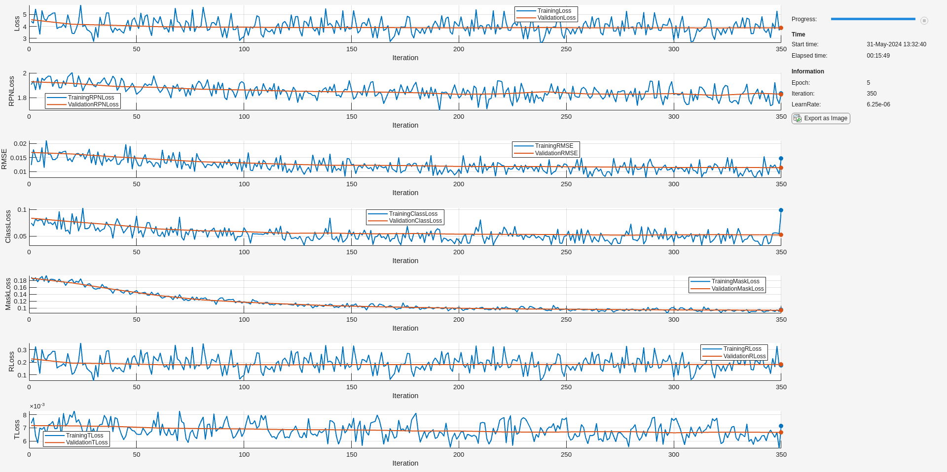 if doTrain outFolder = fullfile(tempdir,"output","train_posemaskrcnn_stage1"); mkdir(outFolder); ckptFolder = fullfile(outFolder, "checkpoints"); mkdir(ckptFolder); disp(outFolder); optionsStage1 = trainingOptions("sgdm", ... InitialLearnRate=0.0001, ... LearnRateSchedule="piecewise", ... LearnRateDropPeriod=1, ... LearnRateDropFactor=0.5, ... MaxEpochs=5, ... Plot="none", ... Momentum=0.9, ... MiniBatchSize=1, ... ResetInputNormalization=false, ... ExecutionEnvironment="auto", ... VerboseFrequency=5, ... ValidationData=dsVal, ... ValidationFrequency=20, ... Plots="training-progress", ... CheckpointPath=ckptFolder,... CheckpointFrequency=2,... CheckpointFrequencyUnit="epoch"); end