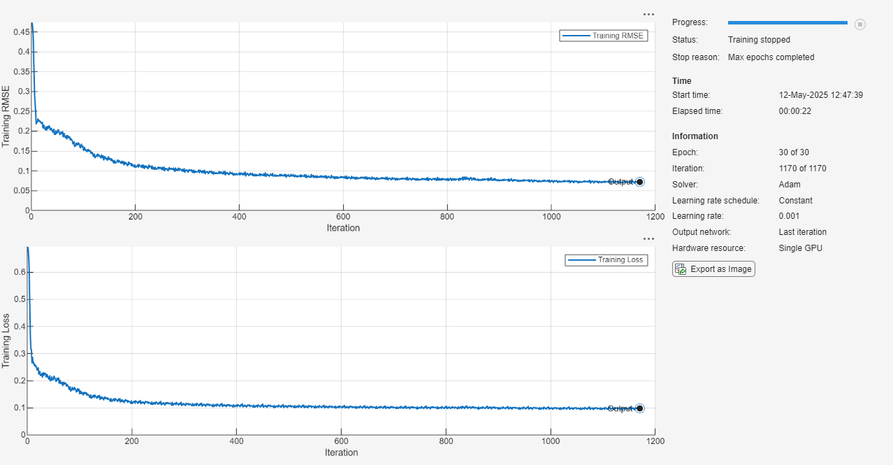 Train the neural network by using the trainnet function. For image reconstruction, use binary cross-entropy loss. By default, the trainnet function uses a GPU if one is available. Using a GPU requires a Parallel Computing Toolbox™ license and a supported GPU device. For information on supported devices, see GPU Computing Requirements (Parallel Computing Toolbox). Otherwise, the function uses the CPU. To specify the execution environment, use the ExecutionEnvironment training option.