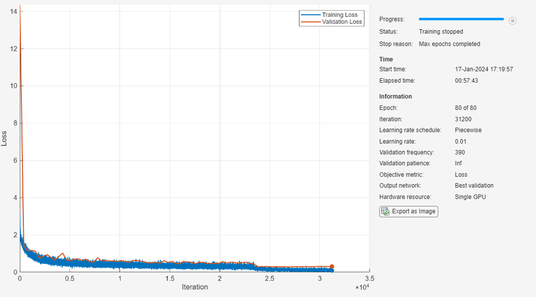 miniBatchSize = 128; learnRate = 0.1*miniBatchSize/128; valFrequency = floor(size(XTrain,4)/miniBatchSize); options = trainingOptions("sgdm", ... InitialLearnRate=learnRate, ... MaxEpochs=80, ... MiniBatchSize=miniBatchSize, ... VerboseFrequency=valFrequency, ... Shuffle="every-epoch", ... Plots="training-progress", ... Verbose=false, ... ValidationData={XValidation,TValidation}, ... ValidationFrequency=valFrequency, ... LearnRateSchedule="piecewise", ... LearnRateDropFactor=0.1, ... LearnRateDropPeriod=60);