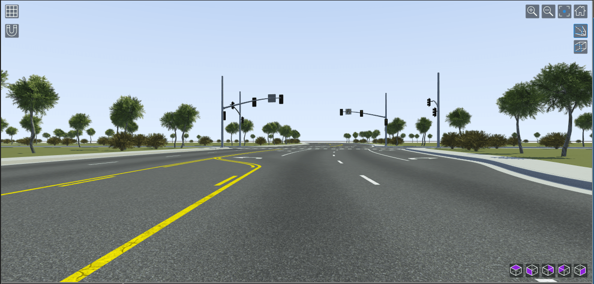 openScenario(rrApp,"TrafficSignal_SpeedReg");The scenario contains a white sedan in a lane. The path of the white sedan is laid out using waypoints and passes through the single traffic signal junction in the scene. The junction contains ten traffic signals that are converted to actors using the Traffic Signal Tool (RoadRunner Scenario).