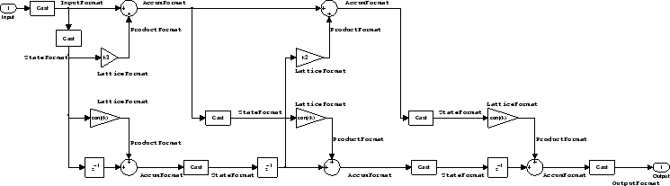 The following figure shows the signal flow for the maximum phase implementation of a moving-average lattice filter implemented by dfilt.latticemamax. To help you see how the filter processes the coefficients, input, and states of the filter, as well as numerical operations, the figure includes the locations of the formatting objects within the signal flow.