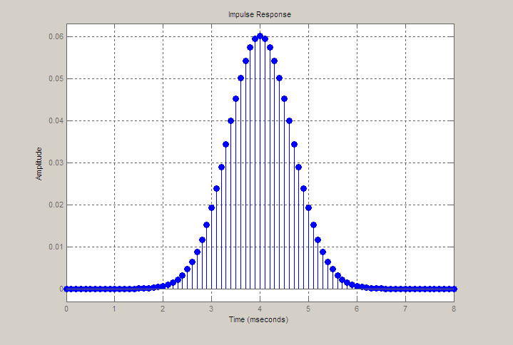 This example shows how to design a raised cosine filter that spans 8 symbol durations (i.e., of order 8 symbols), has a rolloff factor of 0.50, and oversampling factor of 10.