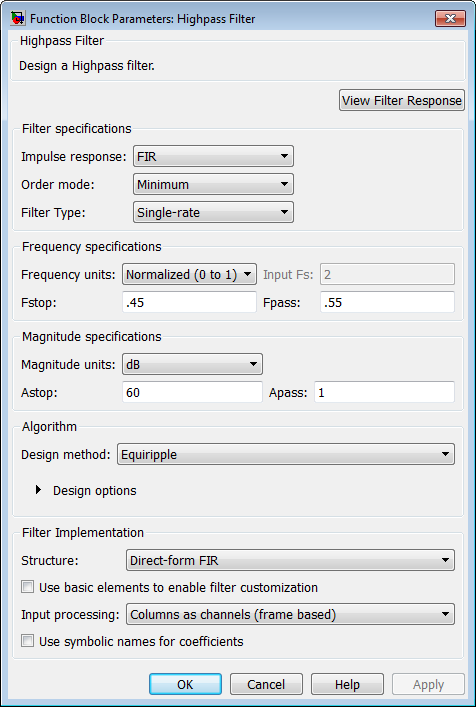 See Highpass Filter Design — Main Pane for more information about the parameters of this block. The Data Types and Code Generation panes are not available for blocks in the DSP System Toolbox™ Filter Designs library.