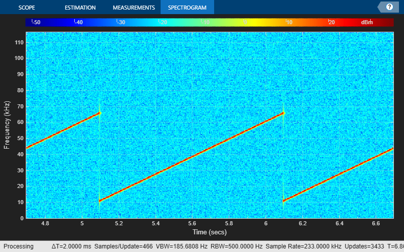 Methodto"welch".FrequencyResolutionMethodto"rbw".RBWSourceto"auto".WindowInvariantSamplesPerUpdatetotrue.