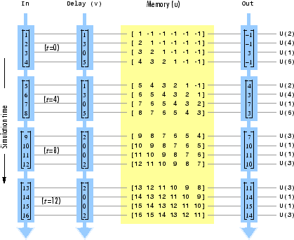 The illustration below shows how this works for an input with a sample period of 1 and frame size of 4. The Maximum delay (Dmax) is 5, and the Initial conditions parameter is set to -1. The delay input changes from [1 3 0 5] to [2 0 0 2] after the second input frame. The samples in each output frame are the values in memory indexed by the elements of v: