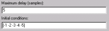 U(2:D+1), where D is the Maximum delay. For a scalar input and the parameters in the next figure, the block initializesU(2:6)with values[-1, -1, -1, 0, 1].