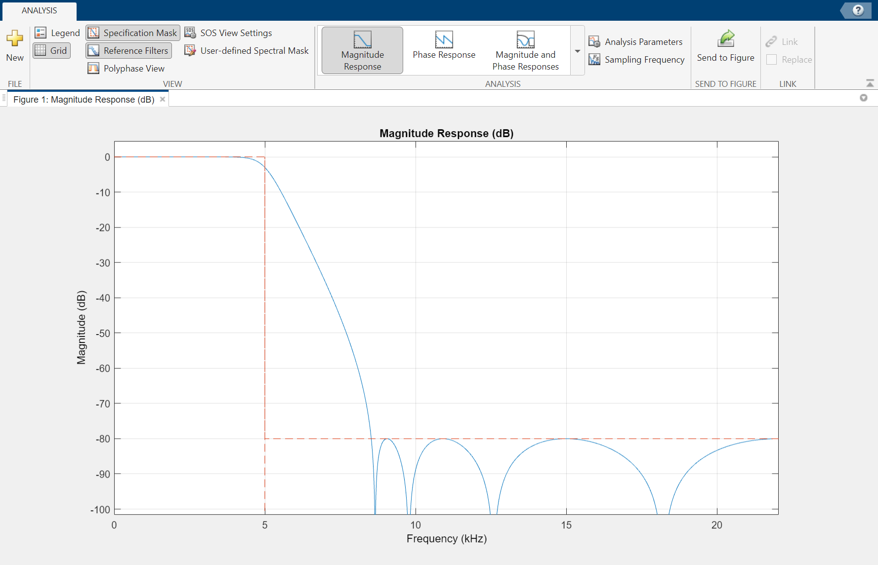 Click Apply. To visualize the filter's frequency response, click View Filter Response. The filter is maximally flat. There is no ripple in the passband or in the stopband. The filter response is within the specification mask (the red dotted line).