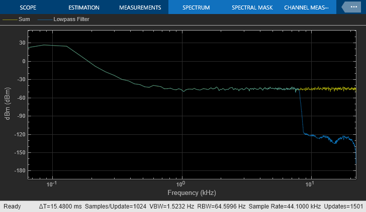 In the model, a noisy sine wave sampled at 44.1 kHz passes through the filter. The sine wave is corrupted by Gaussian noise with zero mean and a variance of 10e-5. Run the model. The view in the Spectrum Analyzer shows the original and filtered signals.