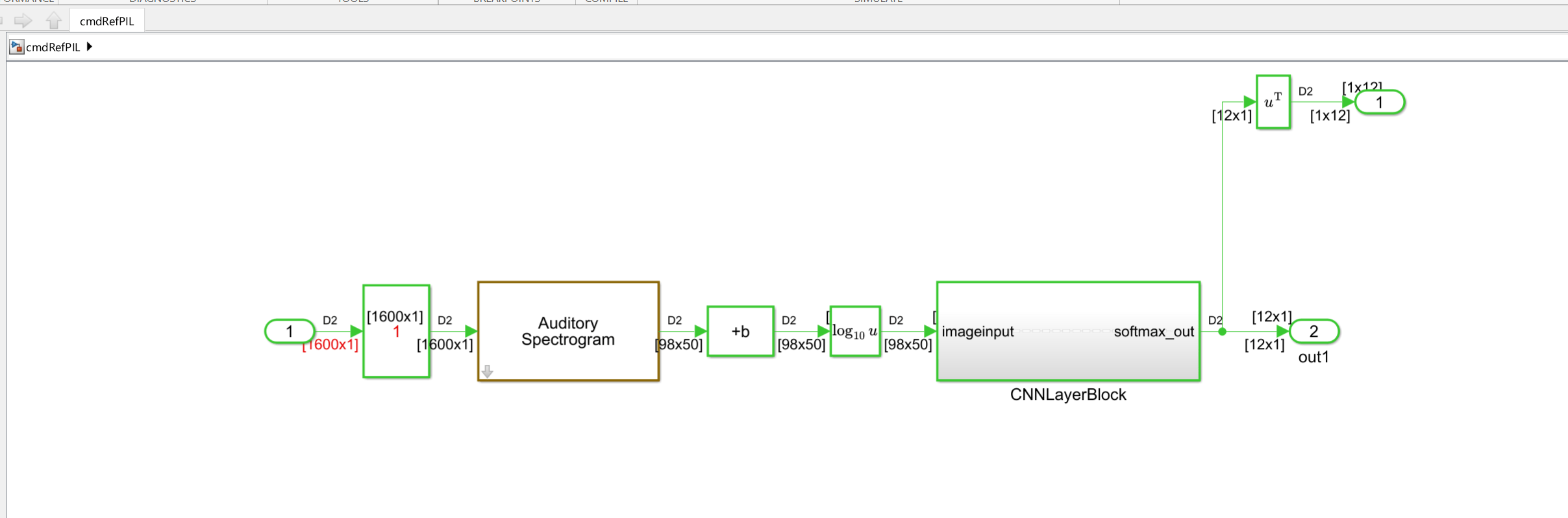Open the reference model cmdRefPIL and replace the CNNLayerBlock subsystem with the subsystem generated using the exportNetworktoSimulink function. Make sure that the input block properties match the top-level model.