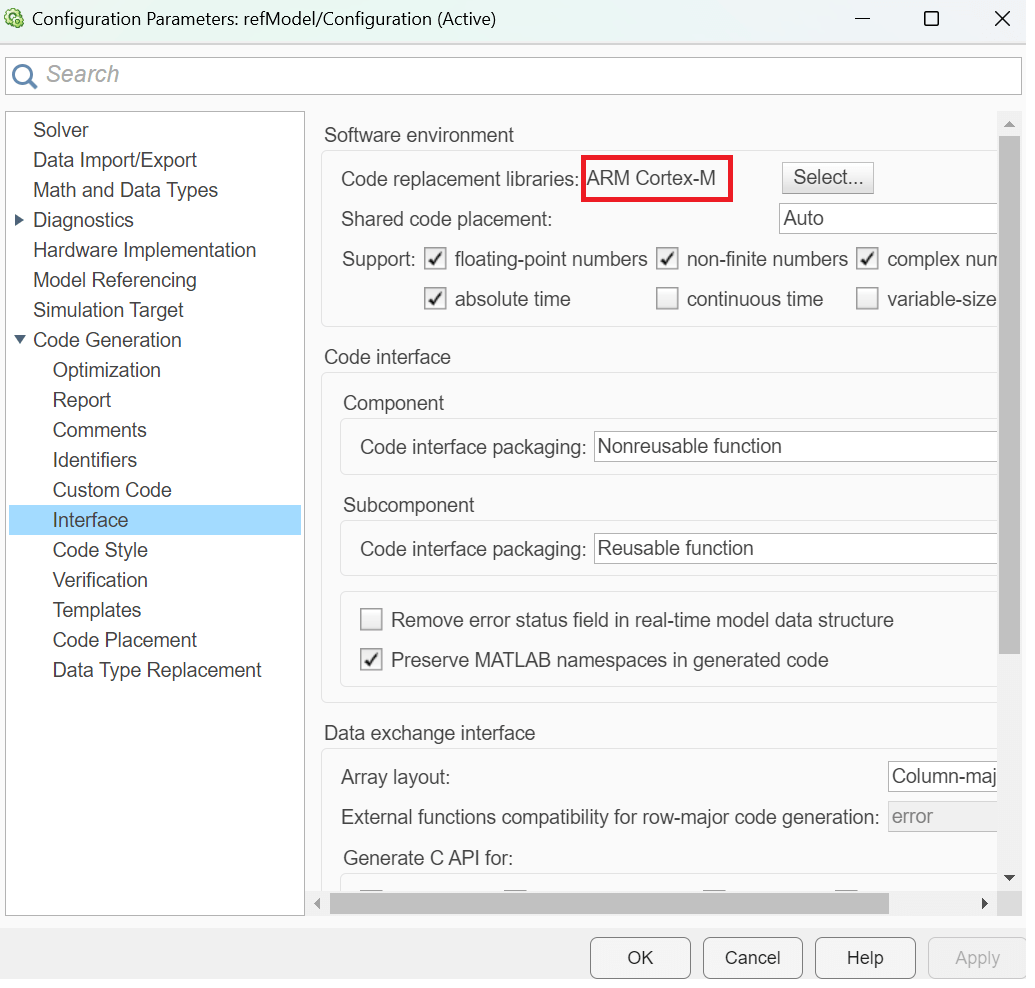 To generate optimized code for your ARM Cortex-M hardware, set the Code replacement libraries to ARM Cortex-M.