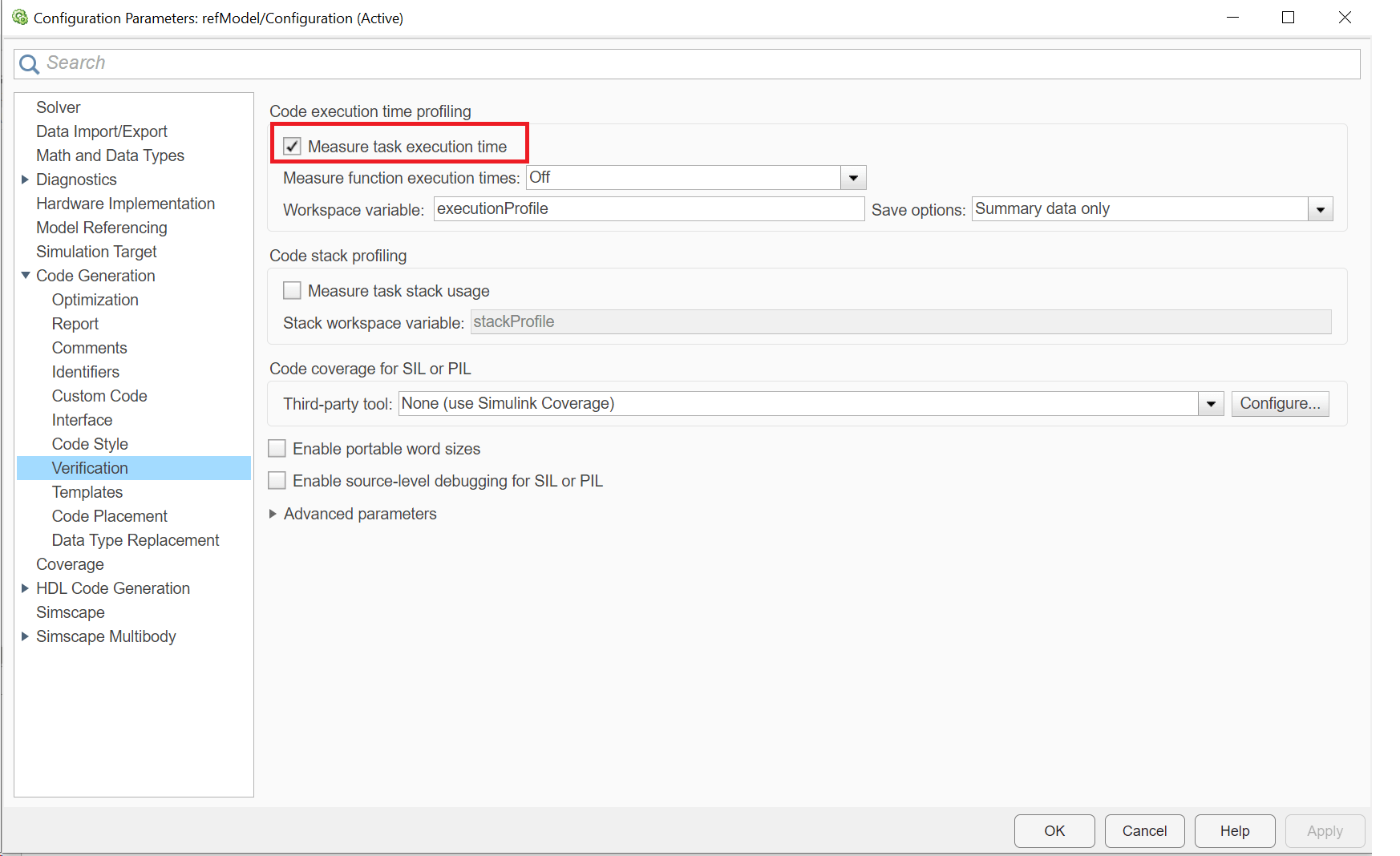 To get the execution time of the generated code without the CRL, set the Code replacement libraries parameter in the Configuration Parameters dialog box to None while configuring the cmdRefPIL model and run the model.