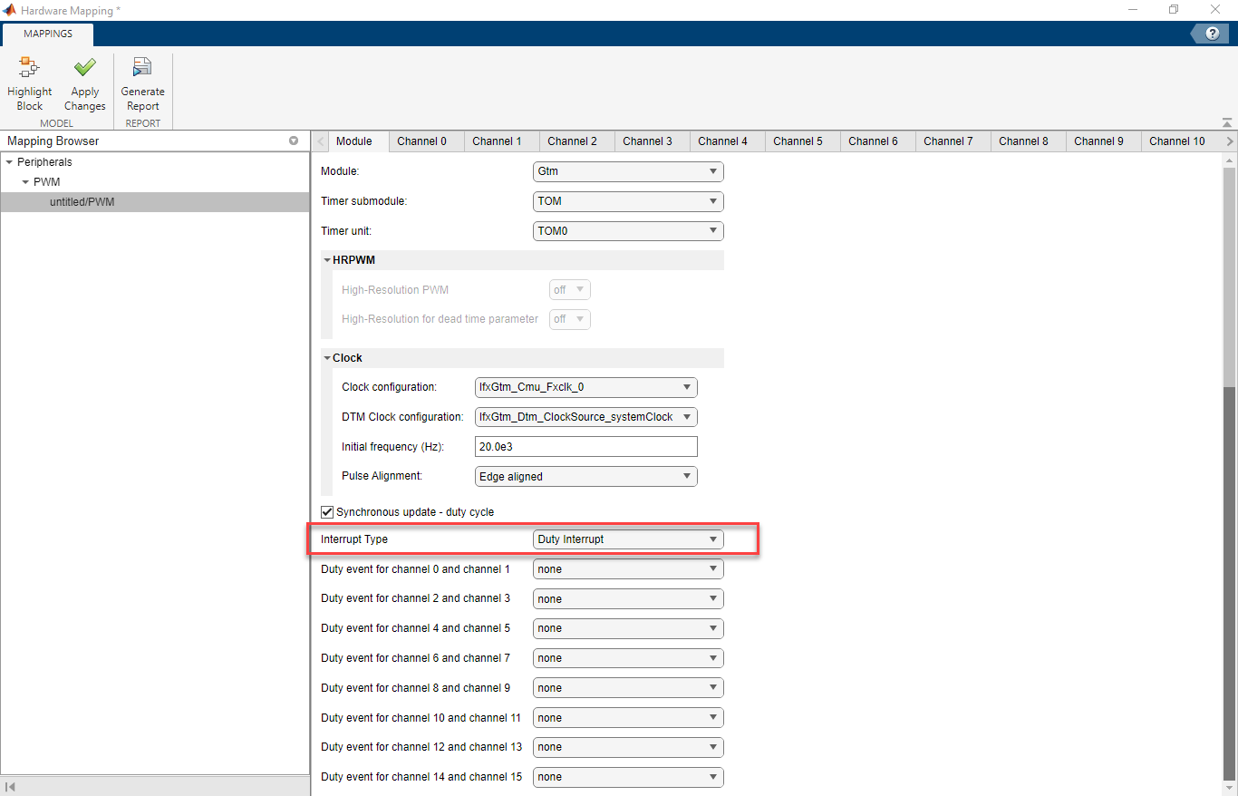 PWM.The PWM Global parameters are available only if more than two PWM blocks are used in the model. For more, see Map Tasks and Peripherals Using Hardware Mapping.