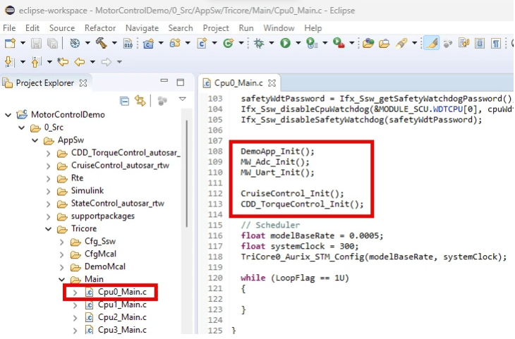 So far, you have imported the MCAL project and Simulink generated code, support packages, and Infineon iLLD drivers into the AUTOSAR project structure. Next, you must integrate the initialization files and runnables to ensure MCAL drivers, AUTOSAR Basic Software (BSW) modules, and Simulink model configurations start up correctly and consistently every time the application algorithm runs.