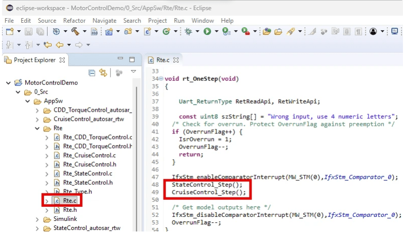 • rte — Files that implement bare-metal scheduler which handles data exchange between the AUTOSAR components. The scheduler uses files such as Rte_CDD_TorqueControl.c, Rte_CruiseControl.c, Rte_StateControl.c, and the corresponding header files. These files coordinate the execution of AUTOSAR runnables and enable communication between software components at a fixed periodic rate. You can use these runtime environment (RTE) files directly in your AUTOSAR project or generate your own in EB Tresos Studio using the rte extension. For more information, see Configure AUTOSAR Runnables and Events (AUTOSAR Blockset) and Configure AUTOSAR Runnable Execution Order (AUTOSAR Blockset).